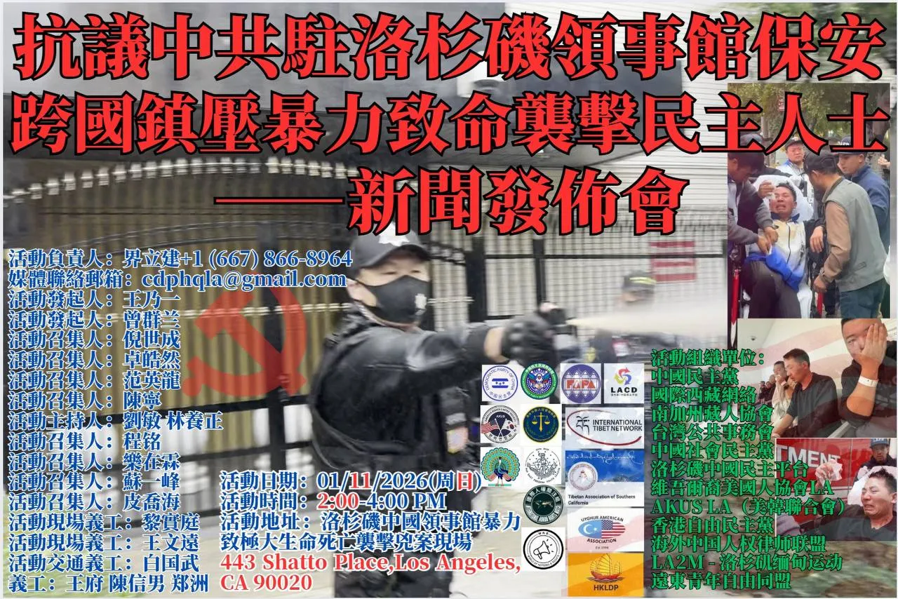 中國駐洛杉磯領事館保安暴力致命襲擊民主人士——新聞發佈會