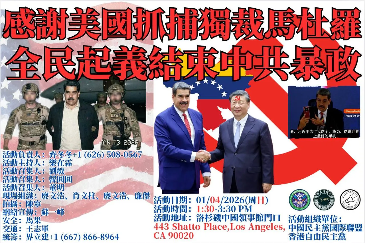 声援全球反独裁运动,感谢美国协助委内瑞拉摆脱独裁统治。呼吁中国人民认清中共暴政本质,团结争取自由、人权与民主,结束中共极权,建立民主中国。 Support global anti-dictatorship movements. Thank the U.S. for backing Venezuela’s democratic transition. Stand for freedom, human rights, and end CCP tyranny.