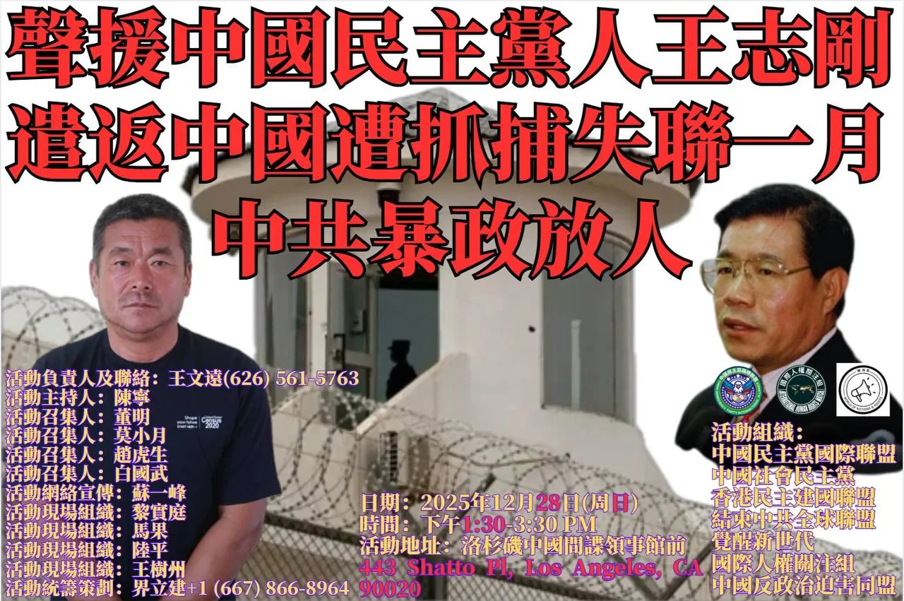 活動主題:聲援被遣返中國後失聯的中國民主黨人王志剛!中共暴政立即放人! 抗議非法抓捕與酷刑,保護民主鬥士人身安全!聲援王志剛,也是保護我們每一個人! Protest the CCP's abduction of pro-democracy activist Wang Zhigang after forced deportation from Saipan! Demand immediate release, legal access, and human rights protections. Free Wang Zhigang! Free Dr. Wang Bingzhang!
