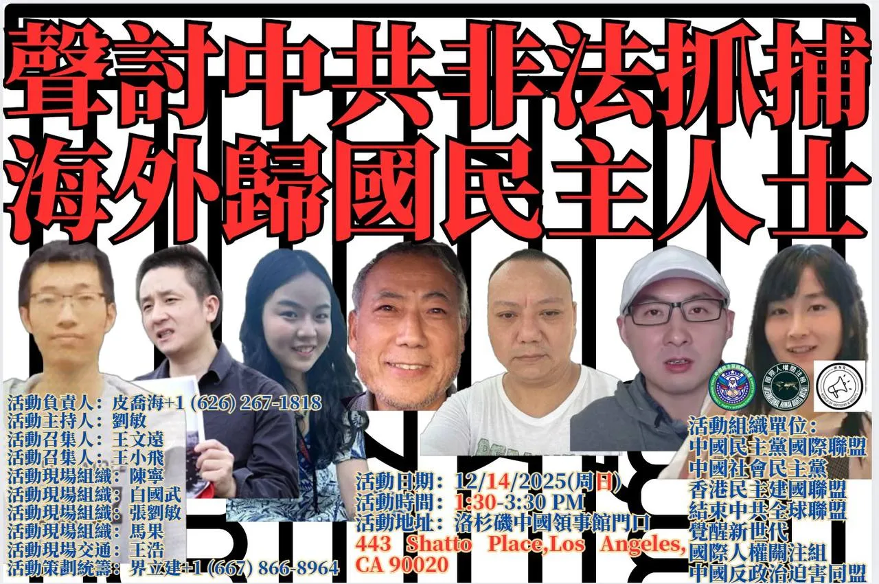 聲討中共暴政非法抓捕海外歸國民主人士、張雅笛、胡洋、溫起峰、張冬寧無罪!